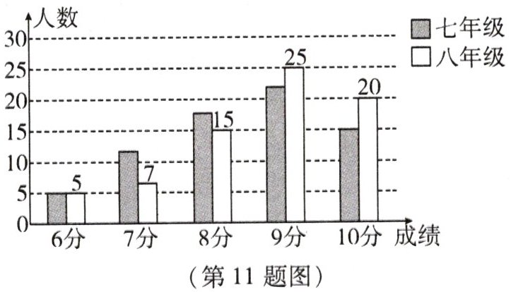 11. 某中学七、八年级各选72名同学参加了“走进古典数学,趣谈数学史话”的数学史知识竞赛,将竞赛成绩进行整理并绘制成如图所示的统计图.已知七年级学生的平均成绩为8.4分,请判断七年级、八年级谁的成绩较好.