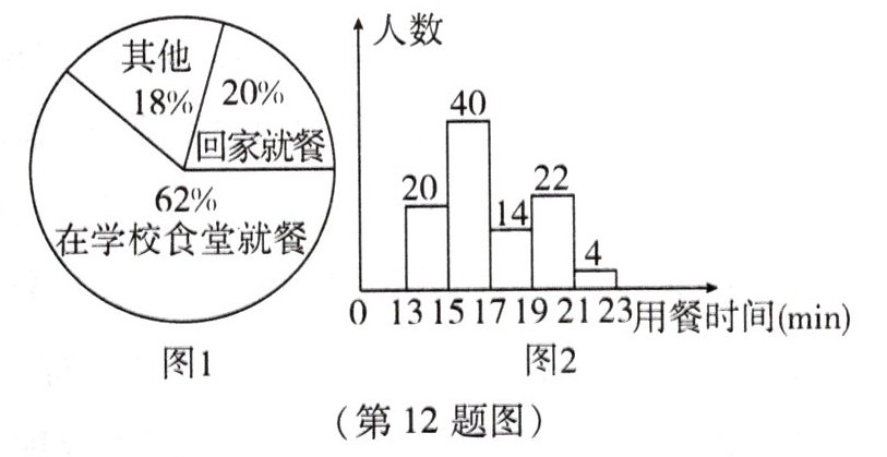 12. 某学校为响应“双减”政策,向学生提供晚餐服务,已知该校共有500名学生,为了做好学生们的取餐、用餐工作,学校首先调查了全体学生的晚餐意向,调查结果如图1所示.为避免就餐拥堵,随机邀请了100名有意向在食堂就餐的学生进行了用餐模拟演练,用餐时间(含用餐与回收餐具)如图2所示.