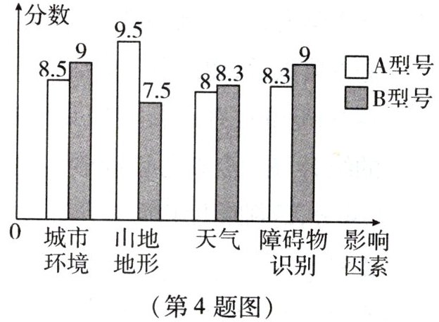 4. 截至2024年底,某外卖平台已开通53条无人机航线,累计配送订单超45万单,为优化无人机配送系统,工作人员对A,B两种型号的无人机受不同因素影响的程度进行评分(评分越高,影响程度越小,满分10分),数据如图所示,平台计划再购进一批无人机,将城市环境、山地地形、天气、障碍物识别四项得分按3:1:2:4的比例确定无人机的综合得分,请通过计算说明平台应选择无人机的型号.