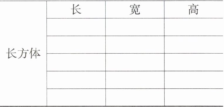 正方体1种,棱长9厘米;长方体5种,分别是长9厘米,宽9厘米,高8厘米;长9厘米,宽9厘米,高7厘米;长9厘米,宽8厘米,高8厘米;长9厘米,宽8厘米,高7厘米;长8厘米,宽8厘米,高7厘米 填表略