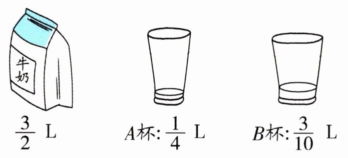 3.把盒中的牛奶全部倒入 A 杯,能倒满几杯?如果全部倒入 B 杯呢?
