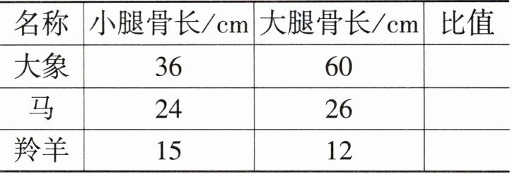 4. 新情境 自然科技 有关资料显示,动物的小腿骨与大腿骨长度的比值越大,这种动物跑得越快。下表是大象、马、羚羊这三种动物小腿骨与大腿骨长度的参考值,完成表格。