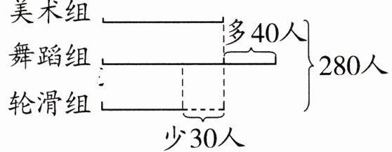3. 美术组:$(280+30-40)÷3=90$(人) 舞蹈组:$90+40=130$(人) 轮滑组:$90-30=60$(人)