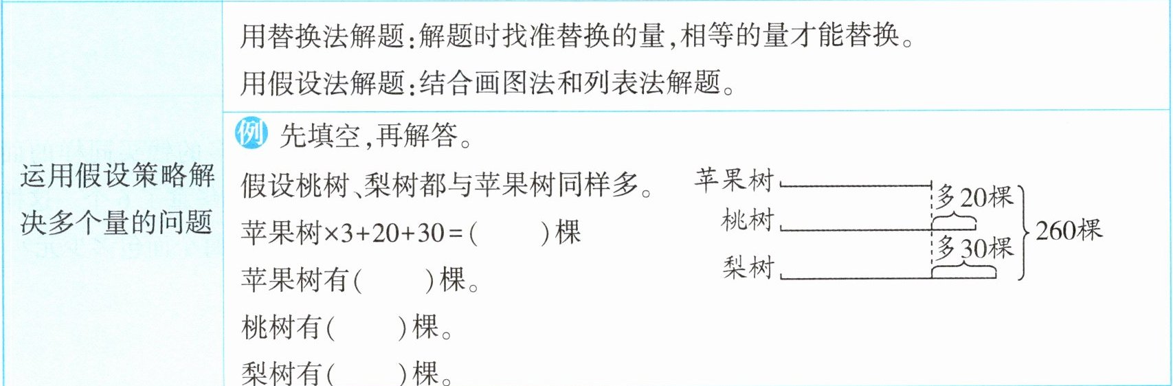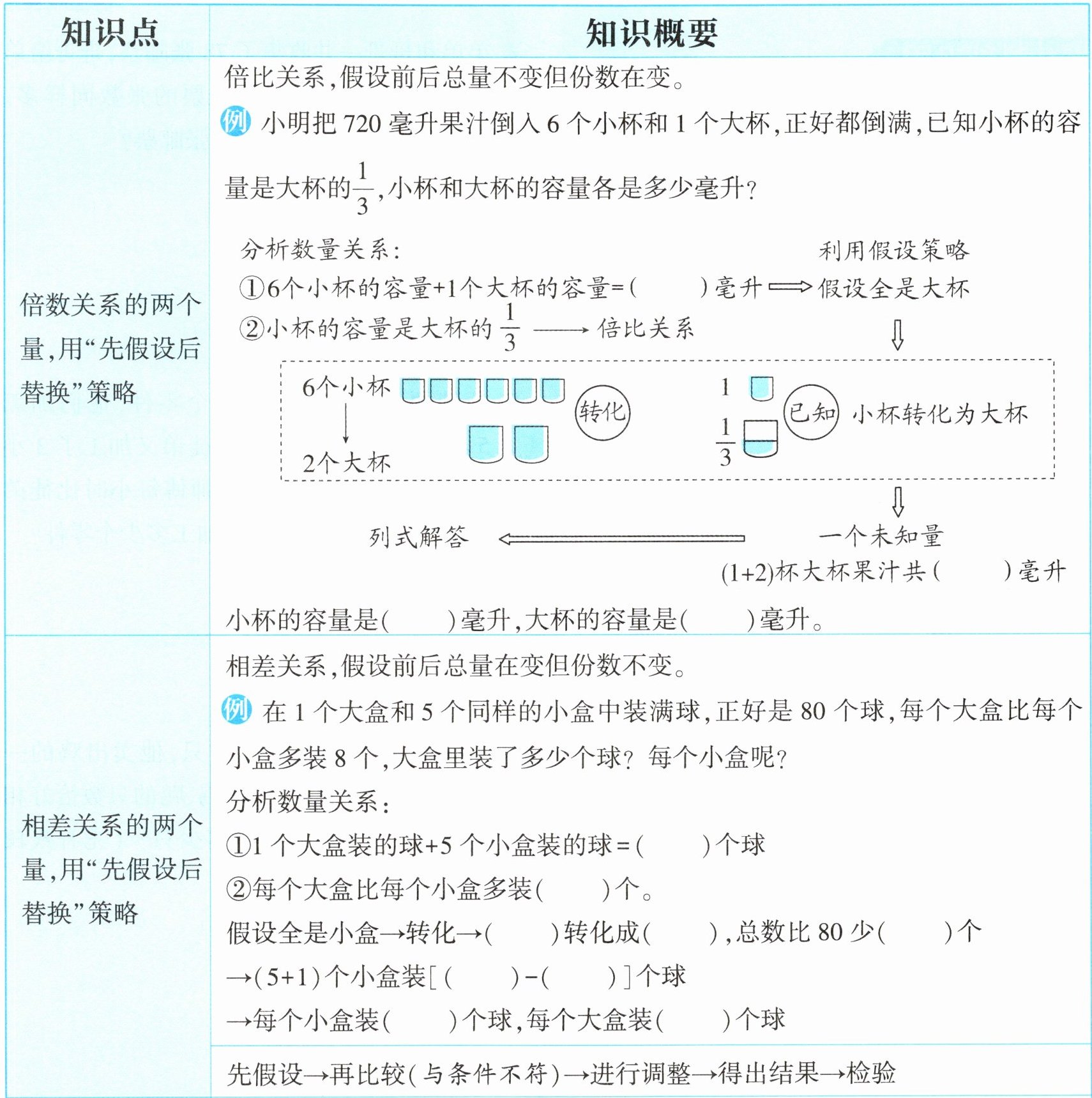 倍数关系的两个量,用“先假设后替换”策略中例的空依次为720、720、80、240;相差关系的两个量,用“先假设后替换”策略中例的空依次为80、8、大盒、小盒、8、80、8、12、20;运用假设策略解决多个量的问题中例的空依次为260、70、90、100