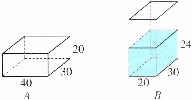 6. 如图,A和B是两个长方体容器,B中的水深是24厘米,如果将B中的水倒入A中,那么A中的水深是多少?(单位:厘米)
