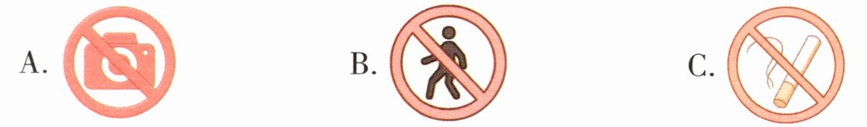 5. A 【点拨】“No photos.”意思是“禁止拍照。”,A 选项图标是禁止拍照标志;B 选项是禁止行走标志,C 选项是禁止吸烟标志,所以选 A。