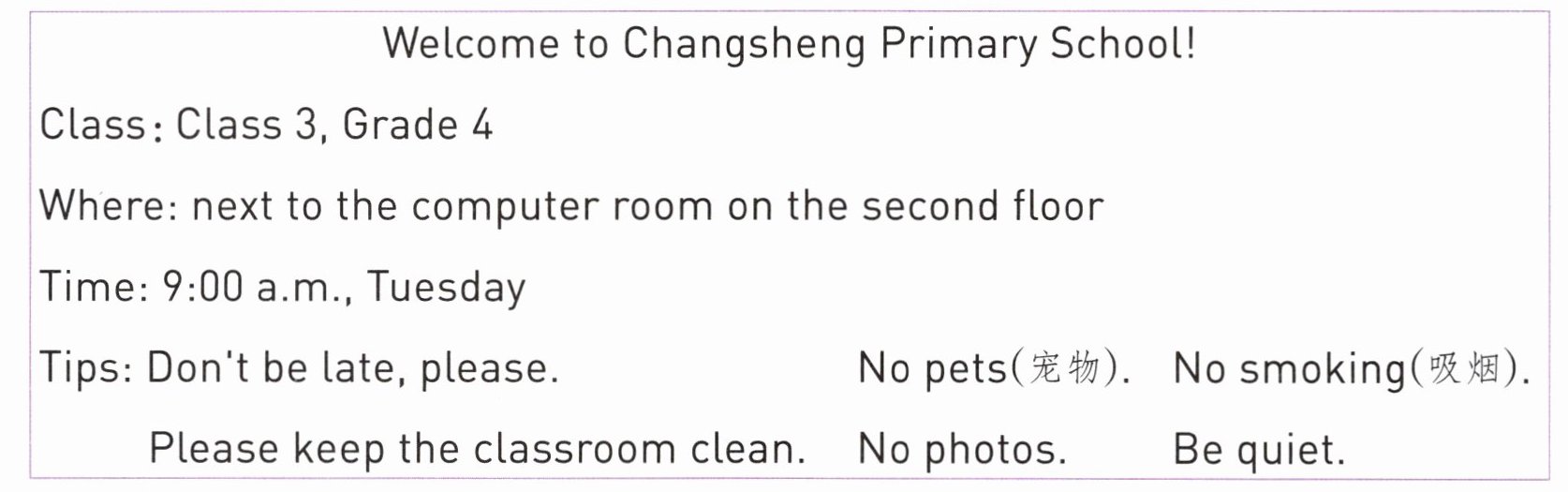 3. C 【点拨】通知中的提示有“Don't be late, please. No pets(宠物). No smoking(吸烟). Please keep the classroom clean. No photos. Be quiet.”,共 6 条规则,C 选项正确。