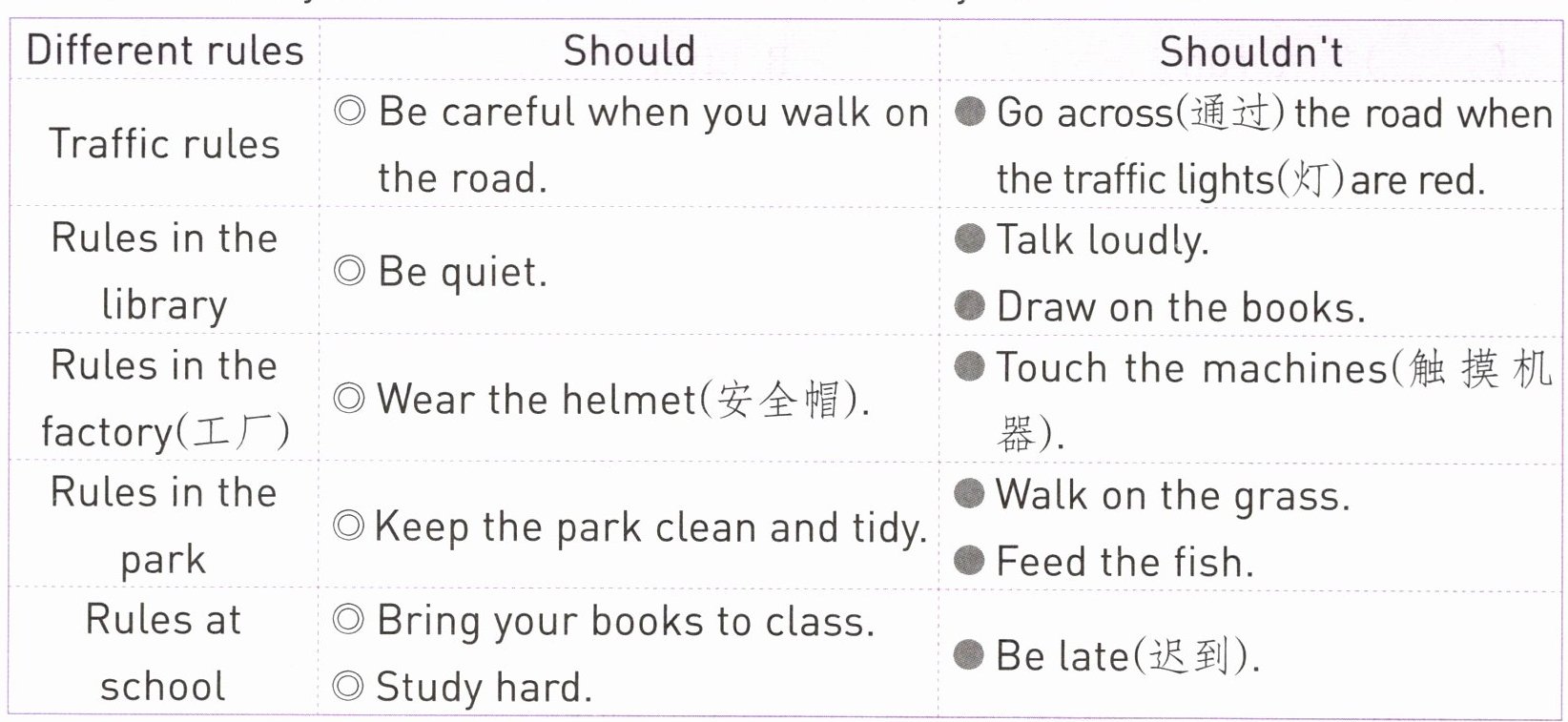 五 下面是Dian dian整理的生活中需要我们遵守的规则,根据表格内容,选择正确选项。