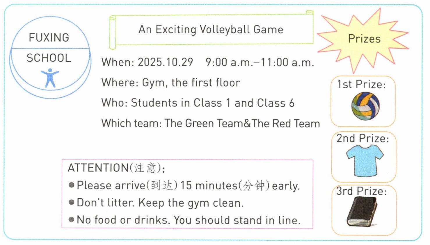 ) We should play hard in each game!( 1 ) Look! There is a volleyball game in the gym. Which team is our school team?