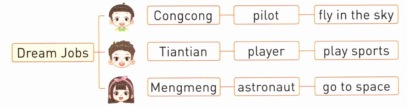 Diandian 总结出朋友们的理想职业。根据思维导图和例句,仿写句子。