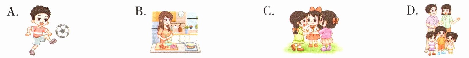 三、同学们展示了自己家庭的生活照。给下列句子选择相对应的图片。