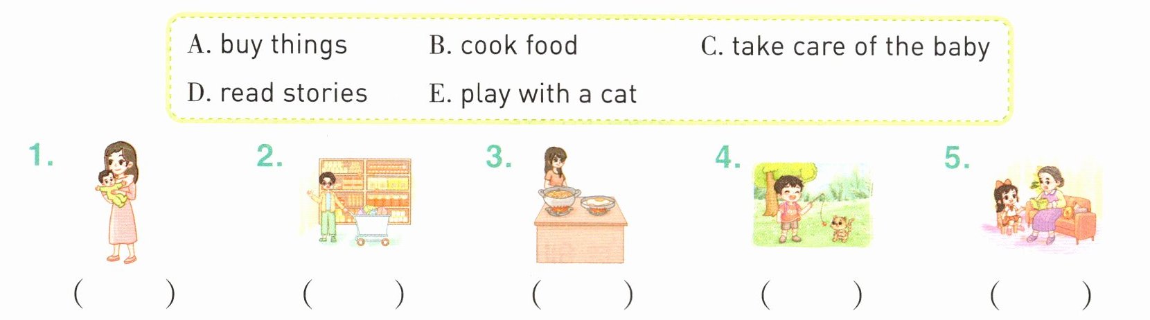 上午 8 点,家人们各有活动。仔细观察图片,选出相符的短语。