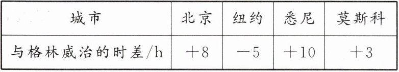 14. 新考向 跨地理·时区 生活中,通常用 $24$ 时计时法表示具体时间。与之相关,全球共分为 $24$ 个时区,相邻两个时区的时间相差 $1h$。以英国格林威治所在的本初子午线为基准,在格林威治以东的地区,时差以“$+$”标记,在格林威治以西的地区,时差以“$-$”标记。下表是各城市与格林威治的时差。