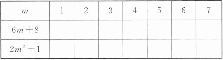 6. [教材 P85 习题 T12 变式题]填写下表,并观察$6m + 8和2m^{2} + 1$这两个代数式的值的变化情况。