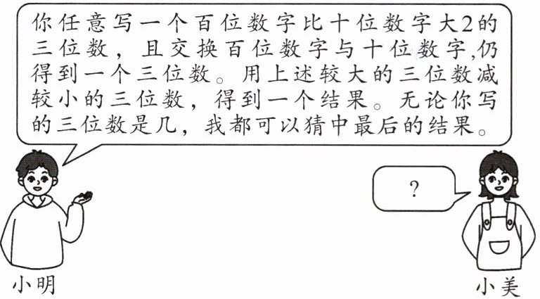 (2)因为百位数字是a,个位数字是b,则十位数字是$(a-2),$所以这个三位数是$100a+10(a-2)+b=100a+10a-20+b=110a+b-20,$百位数字与十位数字交换后的三位数为$100(a-2)+10a+b=100a-200+10a+b=110a+b-200$。因为$(110a+b-20)-(110a+b-200)=110a+b-20-110a-b+200=180,$所以无论小美写的三位数是几,最后的结果都是180。