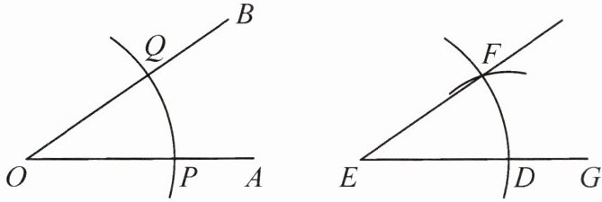 作法:(1)以●为圆心,以任意长为半径作弧,分别交$OA$,$OB于点P$,$Q$;(2)作射线$EG$,并以点$E$为圆心,以◎的长为半径作弧,交$EG于点D$;(3)以点$D$为圆心,以⊙的长为半径作弧,交前面的弧于点$F$;(4)过点$F$作⊕。$∠DEF$就是所要作的角。