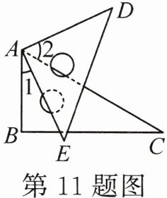 11. 如图,将一个三角尺 $ 60^{\circ} $ 角的顶点与另一个三角尺的直角顶点重合,$ \angle 1 = 25^{\circ}18' $,则 $ \angle 2 = $