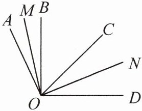 15. 如图,$ OB $,$ OC $ 是 $ \angle AOD $ 内部的两条射线,$ OM $ 平分 $ \angle AOB $,$ ON $ 平分 $ \angle COD $,$ \angle MON = 80^{\circ} $。