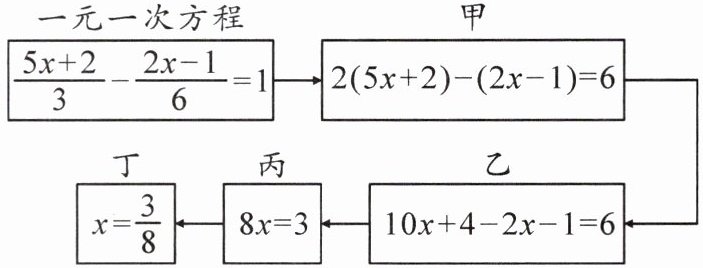 3. 小组活动中,同学们采用接力的方式求一元一次方程的解,规则是:每人只能看到前一人给的式子,并进行一步计算,再将结果传递给下一人,最后求出方程的解。过程如下: