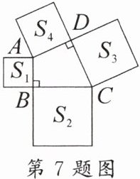 7. 如图,在四边形 $ ABCD $ 中, $ \angle ABC = \angle ADC = 90° $,分别以四边形 $ ABCD $ 的四条边为边向外作四个正方形,面积分别为 $ S_1 $, $ S_2 $, $ S_3 $ 和 $ S_4 $。若 $ S_1 = 1 $, $ S_2 = 4 $, $ S_3 = 3 $,则 $ S_4 $ 的值是 (