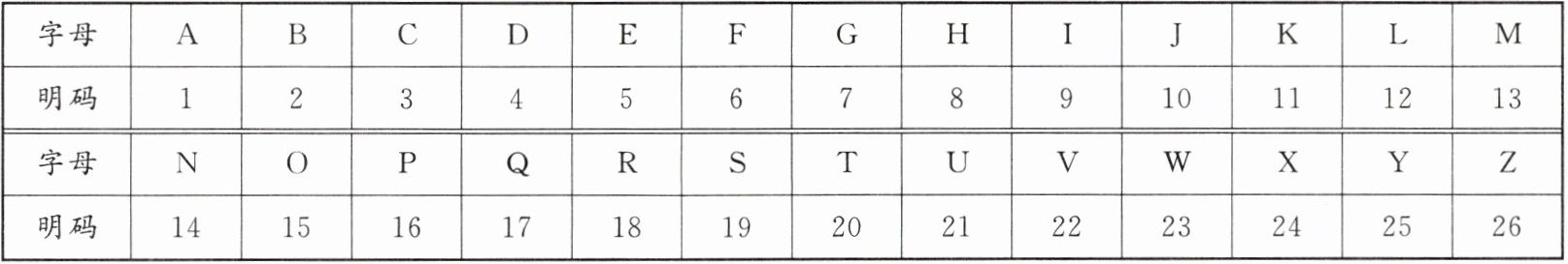 在密码学中,直接可以看到的信息称为明码,加密后的信息称为密码,任何密码只要找到了明码与密码的对应关系——密钥,就可以破译它。八年级(1)班数学兴趣小组用所学的一次函数知识制作了一种密钥的编制程序,他们首先设计了一个“字母——明码对照表”: