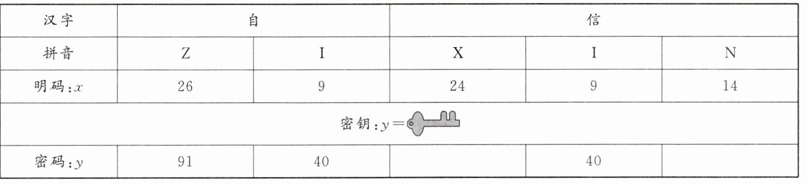 例如,以 $ y = 3x + 13 $ 为密钥,将“自信”二字进行加密转换后得到下表: