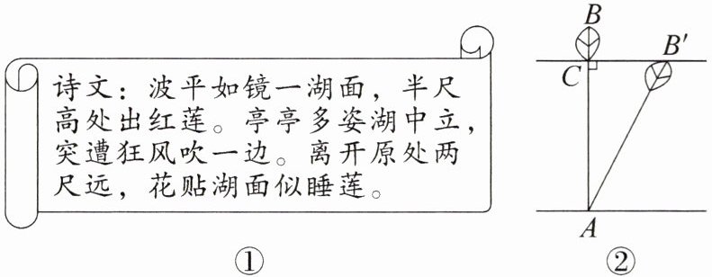 1. 新考向 跨语文·古诗 [2024·吉林中考]图①中有一首古算诗,根据诗中的描述可以计算出红莲所在位置的湖水深度,其示意图如图②,其中 $ AB = AB' $,$ AB \perp B'C $ 于点 $ C $,$ BC = 0.5 $ 尺,$ B'C = 2 $ 尺。设 $ AC $ 的长度为 $ x $ 尺,则可列方程为