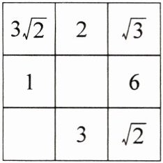 13. 新考向 数学文化·幻方 我国古代的《洛书》记载了世界上最早的幻方——“九宫格”。如图,若要使横、竖、斜对角的$3$个实数相乘都得到同样的结果,则$2$个空格中的实数之积为
