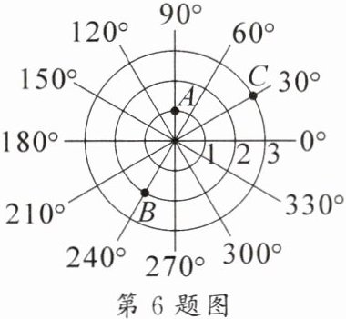 6. [2024·甘孜州中考]如图,在一个平面区域内,一台雷达探测器测得在点$A$,$B$,$C$处有目标出现。按某种规则,点$A$,$B的位置可以分别表示为(1,90^{\circ})$,$(2,240^{\circ})$,则点$C$的位置可以表示为