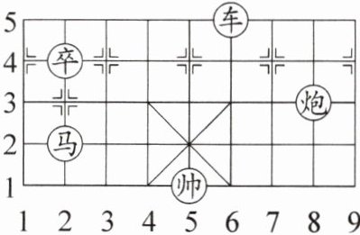 (1)马$(2,2)$,卒$(2,4)$,车$(6,5)$,炮$(8,3)$。