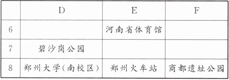 5. 下表是郑州市地图简图的一部分,表中“碧沙岗公园”所在区域表示为 D7,则“河南省体育馆”所在区域可表示为