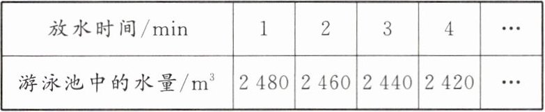 4. 根据要求,游泳池必须定期换水后才能对外开放,在换水时需经“排水 - 清洗 - 注水”的过程。某游泳馆从早上 $ 8:00 $ 开始对游泳池进行换水,已知该游泳池共蓄水 $ 2500 m^{3} $,打开放水闸门匀速放水后,游泳池中的水量和放水时间的关系如下表,则以下说法不正确的是(
