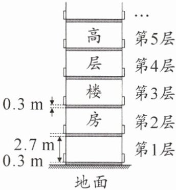 5. 新考向 情境题·楼房 如图是某高层楼房的平面示意图,假设每层室内净高为 $ 2.7 m $,每层楼板厚度为 $ 0.3 m $,第一层高出地面 $ 0.3 m $,顶层平台厚度为 $ 0.3 m $。