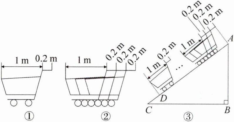 13. 新考向 情境题·购物车列 [2025·郑州高新区期末]为节省空间,工作人员常将购物车叠放在一起形成购物车列。如图①是 1 辆购物车的尺寸,如图②是 3 辆购物车叠放所形成的购物车列,长度为 $ 1.6 $ m。购物车可以通过扶手电梯或直立电梯转运,直立电梯一次性最多能转运 12 辆购物车。如图③,扶手电梯一次性最多转运购物车时,需要在斜坡 $ A C $ 上预留 $ 0.5 $ m($ C D = 0.5 $ m)的安全距离。