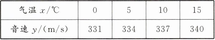 8. 新考向 跨物理·音速 某天晚上,某市在一休闲广场举行了盛大的焰火晚会,场面壮观。已知声音在空气中的传播速度(简称:音速)$ y $(单位:$m/s$)是气温 $ x $(单位:$^{\circ}C$)的一次函数,下表列出了一些不同气温条件下的音速。