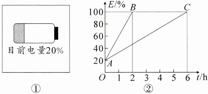 经测试,在用快速充电器和普通充电器对该手机充电时,其电量 $E$(单位:$\%$)与充电时间 $t$(单位:$h$)之间的关系图象分别为图②中的线段 $AB$,$AC$。