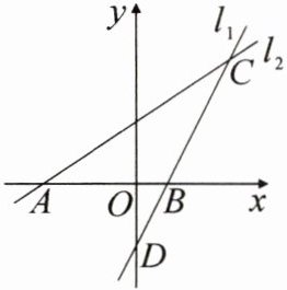 2. 如图,直线$ l_{1} 和直线 l_{2}:y= \frac{2}{3}x + 2 与 x 轴分别交于 B $,$ A $两点,且两直线交于点$ C(m,4) $,直线$ l_{1} 与 y 轴交于点 D(0,-2) $。