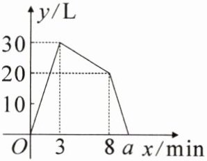 14. 一个装有进水管和出水管的容器,开始时,先打开进水管注水,$3\mathrm{min}$时,再打开出水管排水,$8\mathrm{min}$时,关闭进水管,直至容器中的水全部排完。在整个过程中,容器中的水量$y$(单位:$L$)与时间$x$(单位:$\mathrm{min}$)之间的关系图象如图所示,则图中$a$的值为