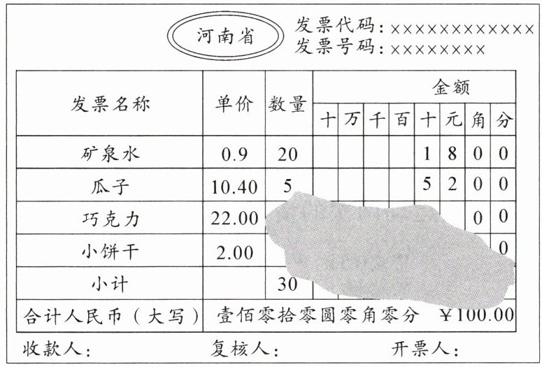 9. 如图是小欣在 A 超市买的一些食品的发票,后来发票不小心被弄烂了,有几个数据看不清。