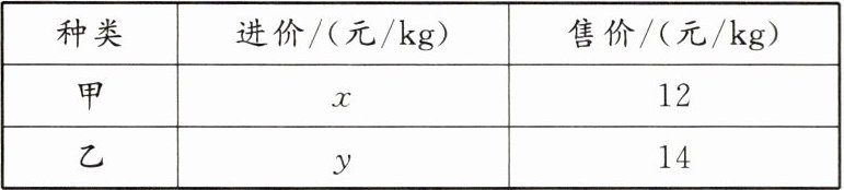 (1) 购进甲种水果 5 kg 和乙种水果 10 kg 需要 160 元;购进甲种水果 12 kg 和乙种水果 5 kg 需要 156 元。求 $ x $, $ y $ 的值。