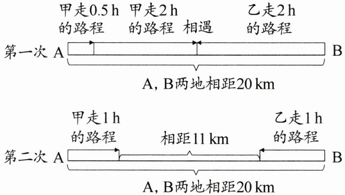 2. [数形结合]甲、乙两人分别从相距 $20km$ 的 $A$,$B$两地出发,相向而行。下图是小华绘制的甲、乙两人运动两次的情形。