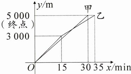 12. 甲、乙两人参加从$A地到B$地的长跑比赛,两人在比赛时所跑的路程$y$(单位:$m$ )与时间$x$(单位:$min$ )之间的关系如图所示。请你根据图象,回答下列问题: