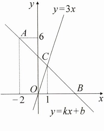 11. 如图,一次函数$y = kx + b的图象经过点A(-2,6)$,且与$x轴交于点B$,与正比例函数$y = 3x的图象交于点C$,点$C的横坐标为1$。