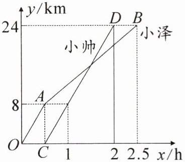 4. [2025·平顶山期末]小泽和小帅两同学先后从甲地出发,骑自行车沿同一条路到乙地参加社会实践活动。如图,折线OAB和线段CD分别表示小泽和小帅离甲地的距离y(单位:km)与时间x(单位:h)之间的关系。根据图中提供的信息,解答下列问题: