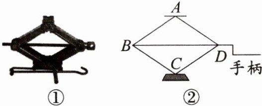 10. 新考向 情境题·千斤顶 如图①是一个千斤顶,其简化的示意图如图②所示,该千斤顶的基本形状是菱形,中间通过螺杆连接,转动手柄可改变 $\angle ADC$ 的大小,从而改变千斤顶的高度(即点 $A$,$C$ 之间的距离)。已知 $AB = 50 cm$,$\angle ABC = 60^{\circ}$,当千斤顶升高约
