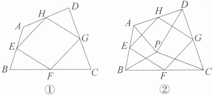 (2) 如图②,$P$ 是四边形 $ABCD$ 内一点,且满足 $PA = PB$,$PC = PD$,$\angle APB = \angle CPD$,点 $E$,$F$,$G$,$H$ 分别为边 $AB$,$BC$,$CD$,$DA$ 的中点。猜想中点四边形 $EFGH$ 的形状,并证明你的猜想;