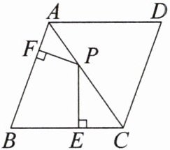5. 如图,在菱形 $ABCD$ 中,$P$ 是对角线 $AC$ 上一动点,过点 $P$ 分别作 $PE \perp BC$ 于点 $E$,$PF \perp AB$ 于点 $F$。若菱形 $ABCD$ 的周长为 $20$,面积为 $24$,则 $PE + PF$ 的值为