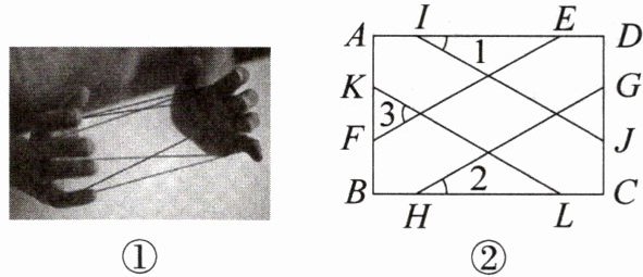 7. 新考向 传统文化·翻花绳 翻花绳是中国民间流传的儿童游戏。如图①是翻花绳的一种图案,可以抽象成图②,在矩形 $ABCD$ 中,$IJ// KL$,$EF// GH$,$\angle 1 = \angle 2 = 30^{\circ}$,则 $\angle 3$ 的度数为