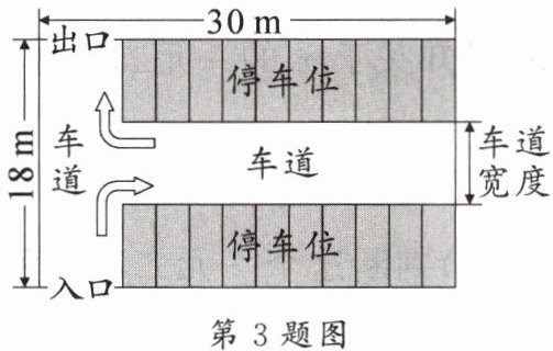 3. 为方便游客停车,该公司增设了一个停车场.如图,停车场外围的长为 30 m,宽为 18 m,停车场内车道宽度都相等.若停车位总占地面积为 364 m²,则车道的宽度为