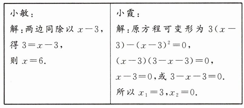 解:小敏:×;小霞:×.正确的解答过程:原方程可变形为3(x-3)-(x-3)²=0,(x-3)(3-x+3)=0,x-3=0,或3-x+3=0.所以x₁=3,x₂=6.